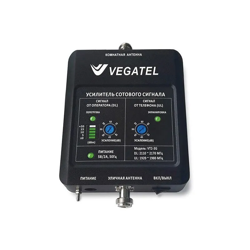 Частотный диапазон 2100 МГц имеет более высокую проницаемость сквозь стены, но ограниченную площадь действия. Чаще всего такие станции связи можно встретить в крупных городах и их окрестностях. Использование сетей 2100 МГц долгое время было ограничено из-за активного применения этих частот военными структурами. В отдельных регионах еще можно встретить зоны с нестабильным 3G-покрытием даже вблизи больших населенных пунктов. Для того, чтобы уловить сигнал от базовой станции, применяется уличная антенна «волновой канал» или антенна панельного типа. Далее, проходя через репитер, сигнал получает необходимое усиление и с помощью комнатной антенны распространяется внутри здания. В свою очередь, когда сигнал от вашего устройства (смартфона, модема и т. п.) попадает на комнатную антенну, он отправляется через репитер в сторону базовой станции. Репитер не может работать без подключения кабельных сборок и двух антенн.
