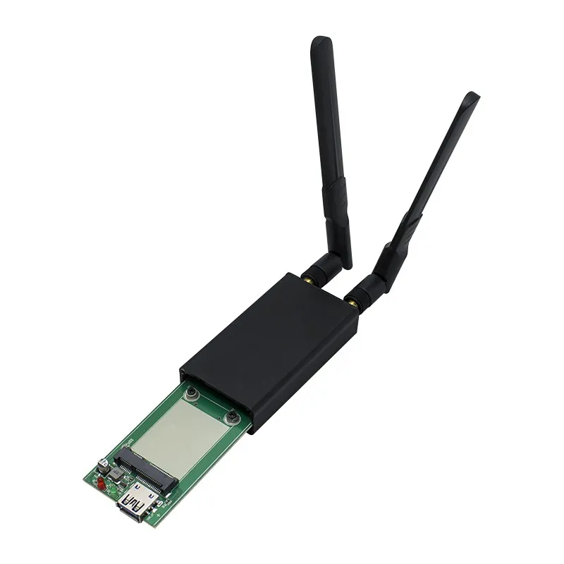 Адаптер в виде небольшой металлической коробочки с подключаемыми антеннами позволяет использовать модемы формата Mini PCI-e с компьютером, ноутбуком или Wi-Fi маршрутизатором. Внутри этого адаптера находится слот для установки сотового модуля соответствующего форм-фактора. Разъемы для подключения антенн — компактные, типа SMA.