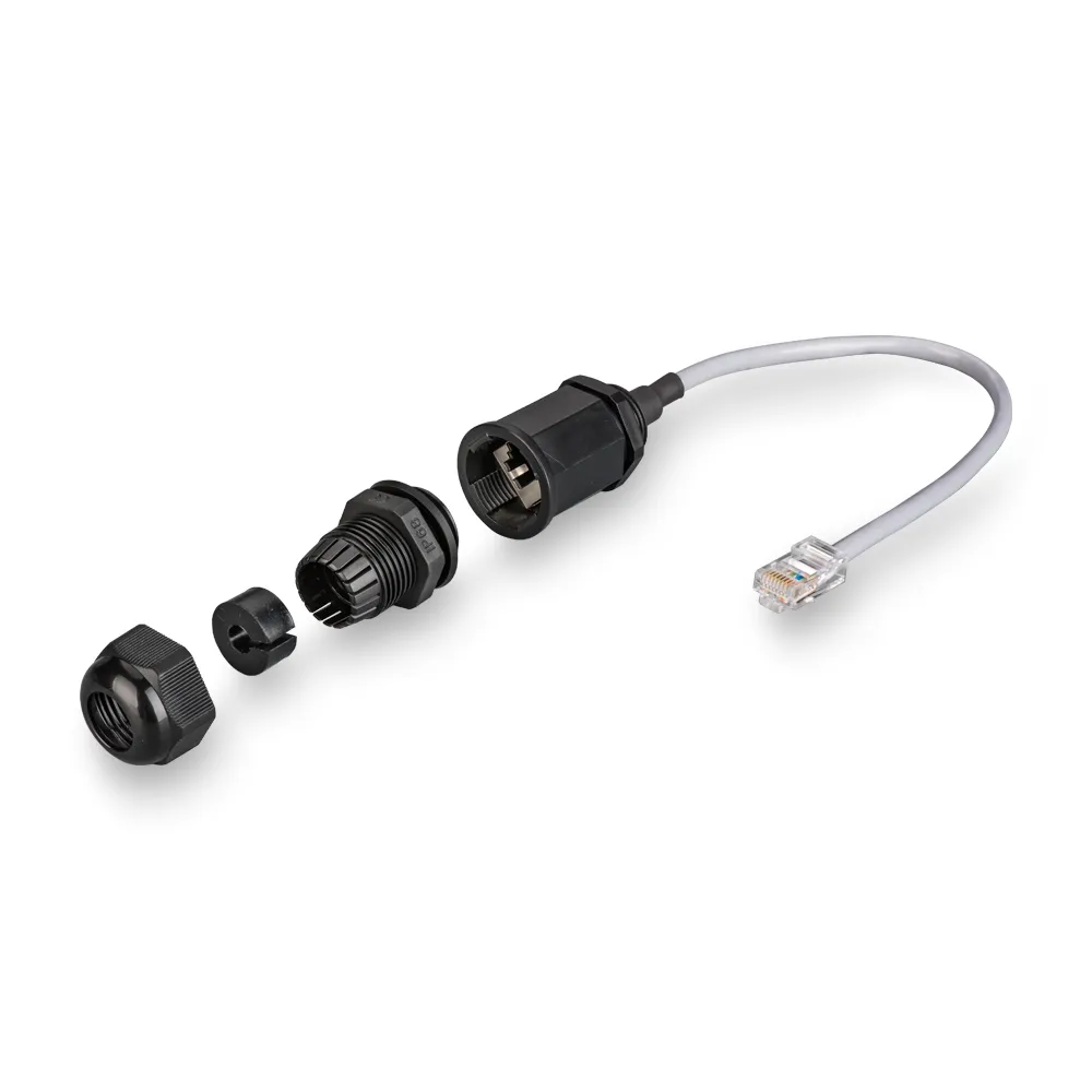 Герметичные RJ45 разъемы состоят из розетки, размещаемой на панели, корпуса в котором размещается стандартная розетка RJ 45 и защитного колпачка в резиновым разрезным кольцом для герметизации кабельного ввода. Все резьбовые соединения уплотнены резиновыми кольцами, допускающими многократное быстроразъемное соединение.
