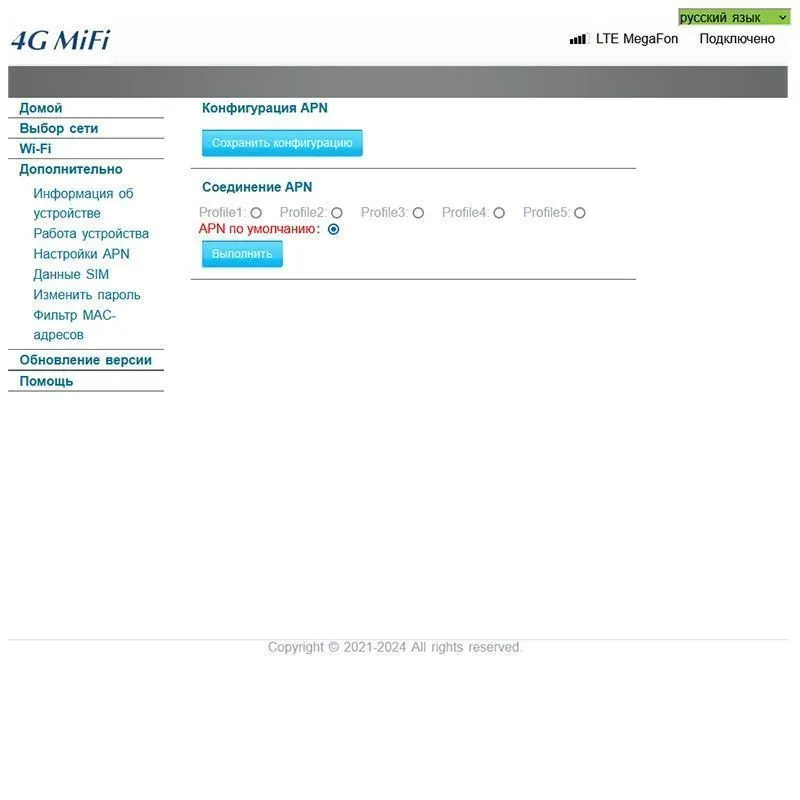 - Возможность ручной настройки APN, выбора типа сети, фильтрации MAC‑адресов