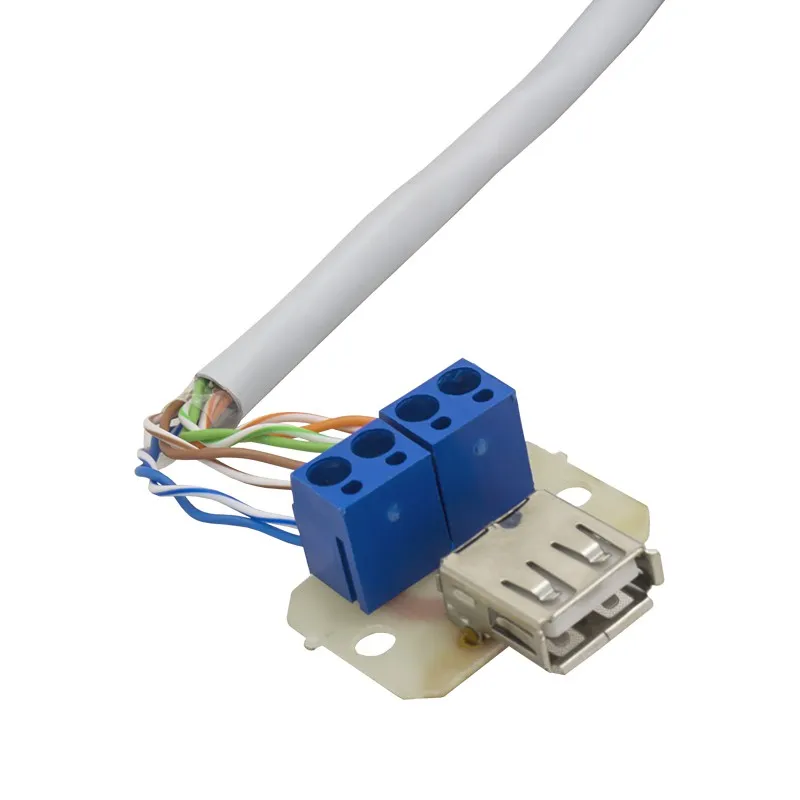 Кроме того, удлинитель имеет разборную конструкцию, которая облегчает монтаж и ремонт. Штекер USB-A имеет дополнительный защищенный пластиковый корпус для удобного сопряжения с ответным разъемом. И штекер, и розетка имеют разборную конструкцию, которая делает возможным монтаж кабеля сквозь узкие отверстия Ø8–9 мм. Монтаж разъемов к жилам кабеля происходит через клеммные колодки с винтовым соединением, то есть не требует пайки.