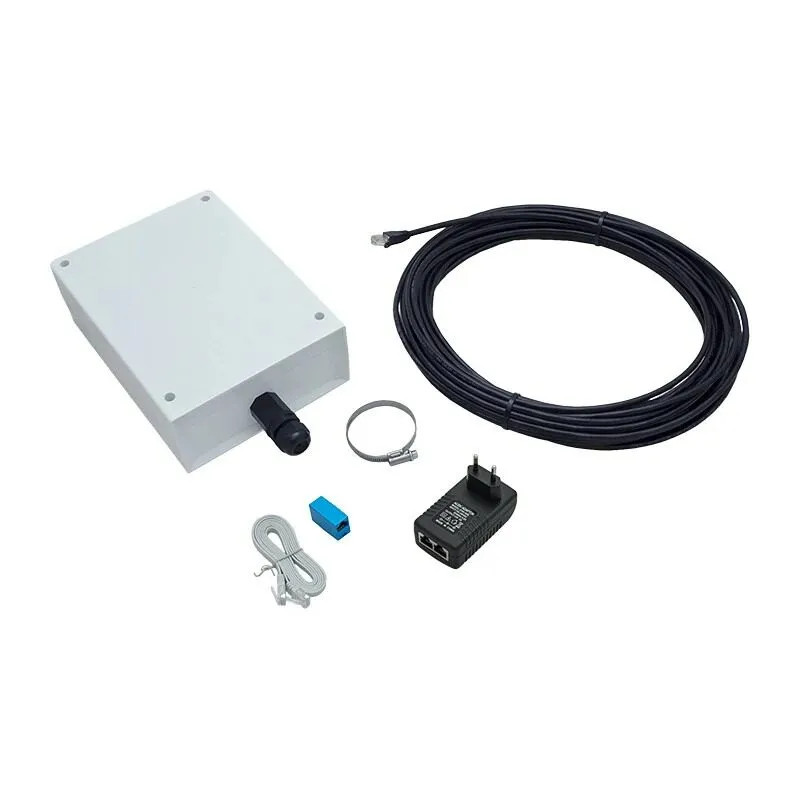 - Модель способна передавать питание и поток данных по единому кабелю. В комплекте предусмотрен инжектор PoE, который выступает в роли Ethernet-разветвителя. Его питание осуществляется через розетку. В момент передачи данных питание не требуется.